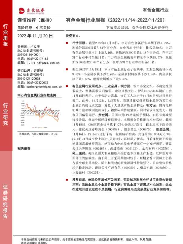 【东莞证券】【20221120】20221120-东莞证券-有色金属行业周报:下游需求减弱,有色金属整体表现低迷-11页