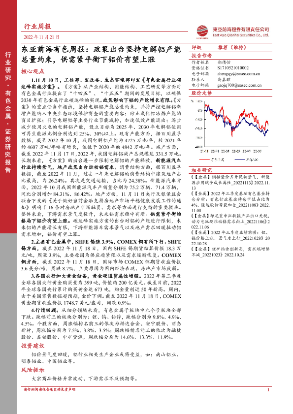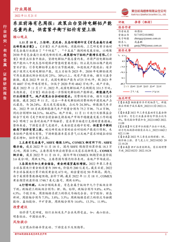 【东亚前海证券】【20221121】东亚前海有色周报:政策出台坚持电解铝产能总量约束,供需紧平衡下铝价有望上涨-21页