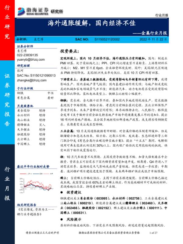 【渤海证券】【20221122】20221122-渤海证券-金属行业月报:海外通胀缓解,国内经济不佳-27页