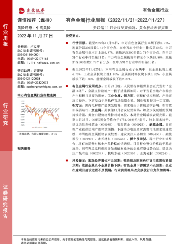 【东莞证券】【20221127】20221127-东莞证券-有色金属行业周报:美联储11月会议纪要偏鸽,黄金板块表现亮眼-11页