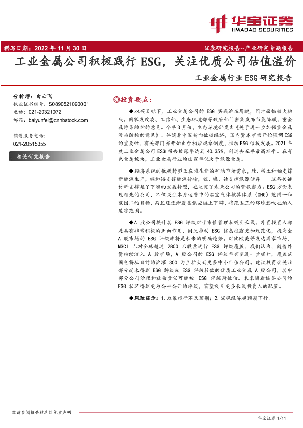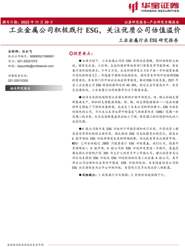 【华宝证券】【20221130】20221130-华宝证券-工业金属行业ESG研究报告:工业金属公司积极践行ESG,关注优质公司估值溢价-11页