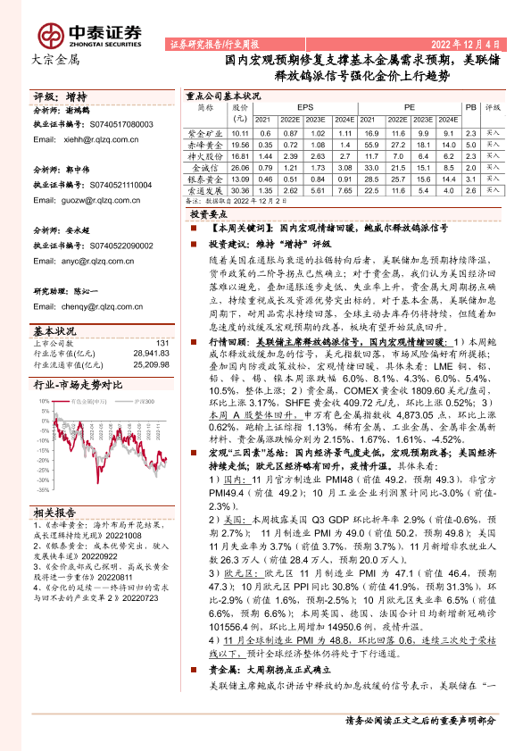 【中泰证券】【20221204】20221204-中泰证券-大宗金属行业周报:国内宏观预期修复支撑基本金属需求预期,美联储释放鸽派信号强化金价上行趋势-30页