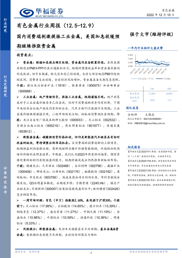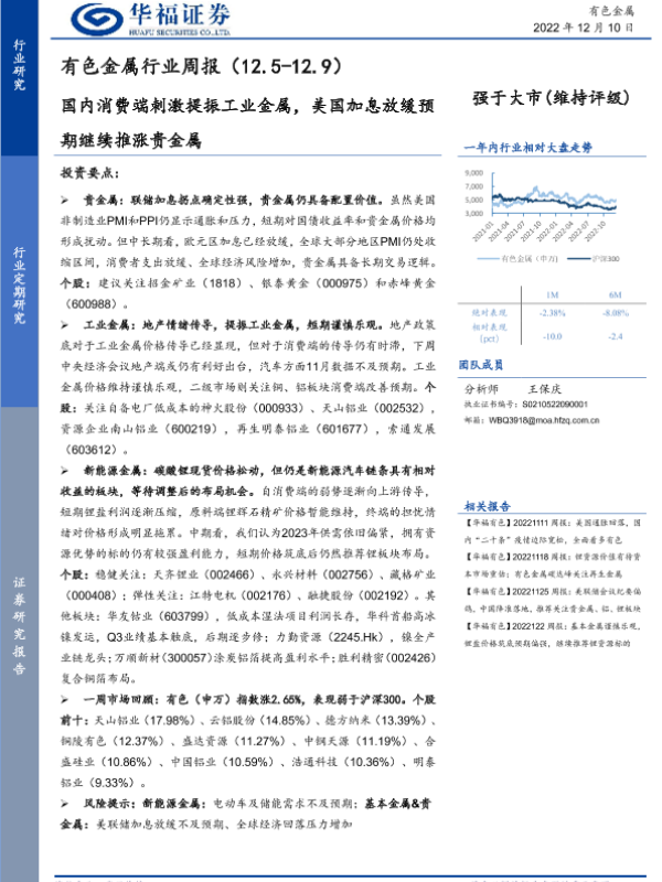 【华福证券】【20221210】20221210-华福证券-有色金属行业周报:国内消费端刺激提振工业金属,美国加息放缓预期继续推涨贵金属-15页
