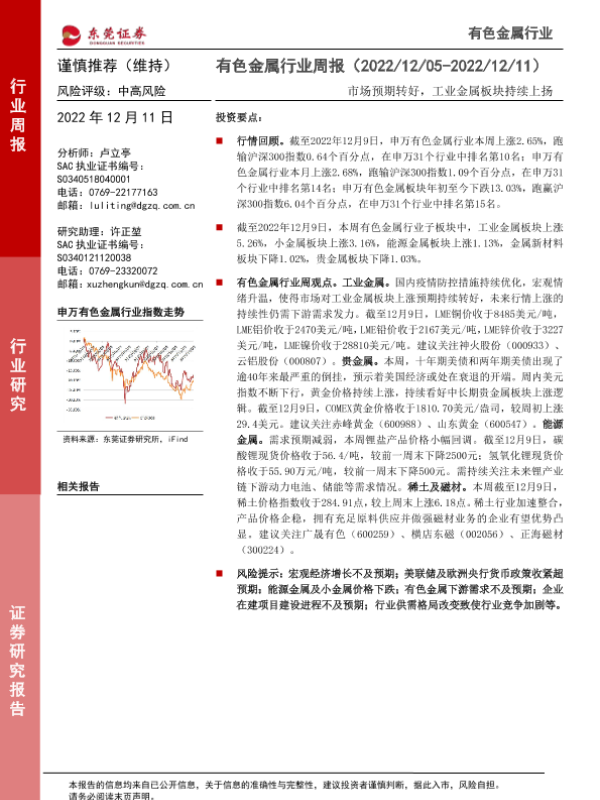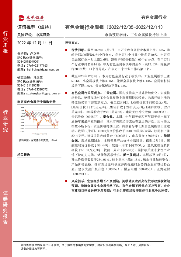 【东莞证券】【20221211】20221211-东莞证券-有色金属行业周报:市场预期转好,工业金属板块持续上扬-11页
