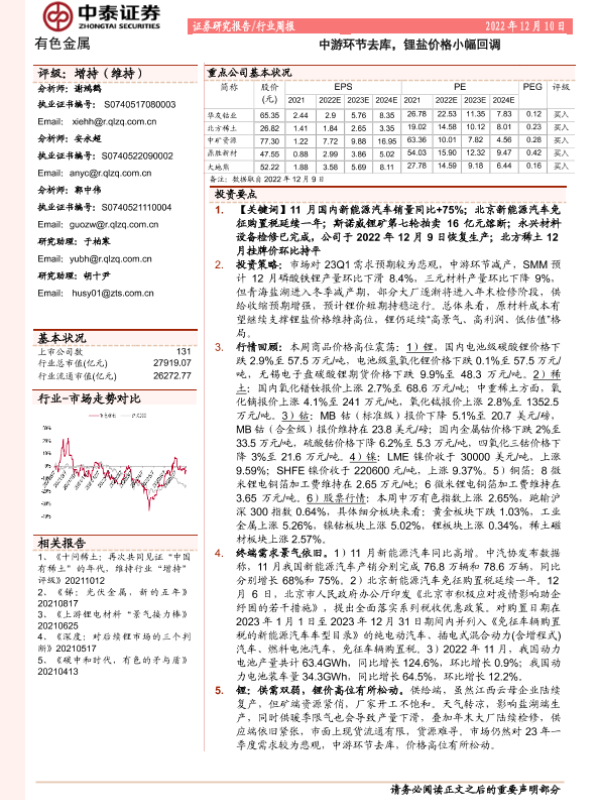 【中泰证券】【20221210】中泰证券-有色金属行业周报:中游环节去库,锂盐价格小幅回调-25页