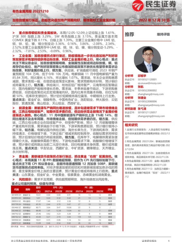 【民生证券】【20221210】20221210-民生证券-有色金属周报:加息放缓渐行渐近,防疫优化叠加地产预期向好,继续看好工业金属价格-26页