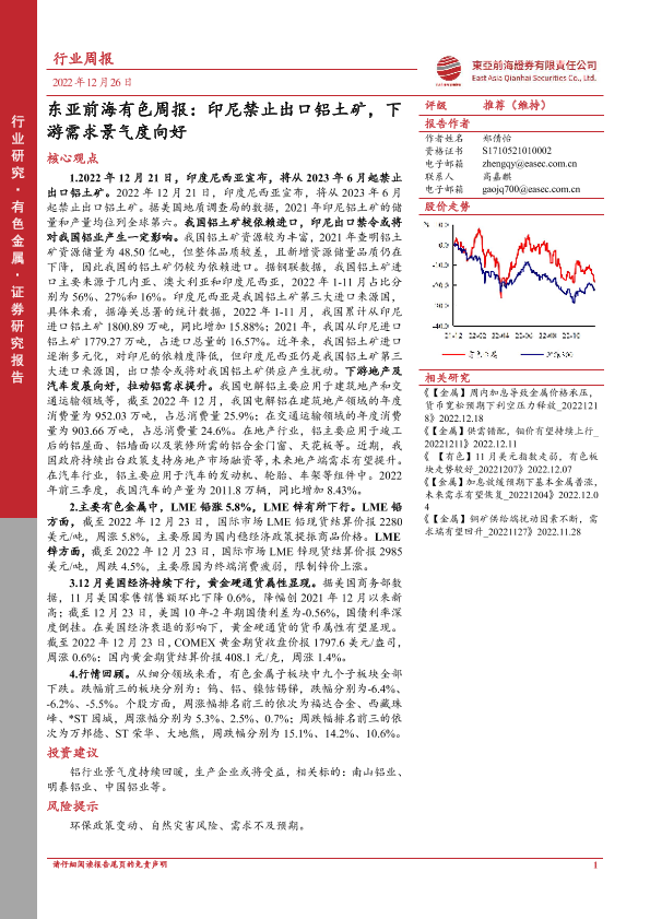 【东亚前海证券】【20221226】东亚前海有色周报:印尼禁止出口铝土矿,下游需求景气度向好-20页
