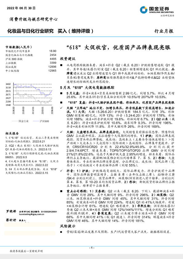 【国金证券】【20220630】化妆品与日化行业月报:“618”大促收官,优质国产品牌表现亮眼-16页