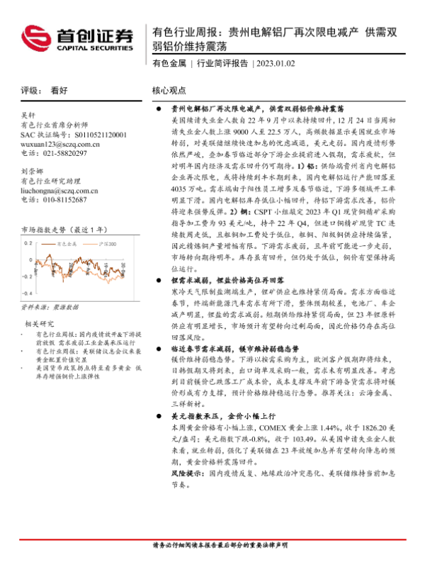 【首创证券】【20230102】20230102-首创证券-有色行业周报:贵州电解铝厂再次限电减产 供需双弱铝价维持震荡-19页