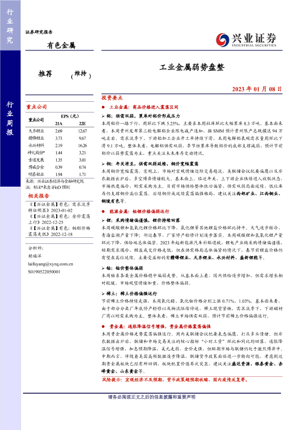 【兴业证券】【20230108】20230108-兴业证券-有色金属行业周报:工业金属弱势盘整-20页