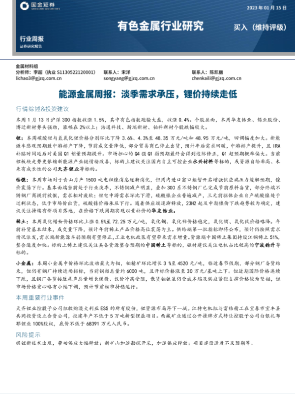 【国金证券】【20230115】能源金属周报:淡季需求承压,锂价持续走低-15页