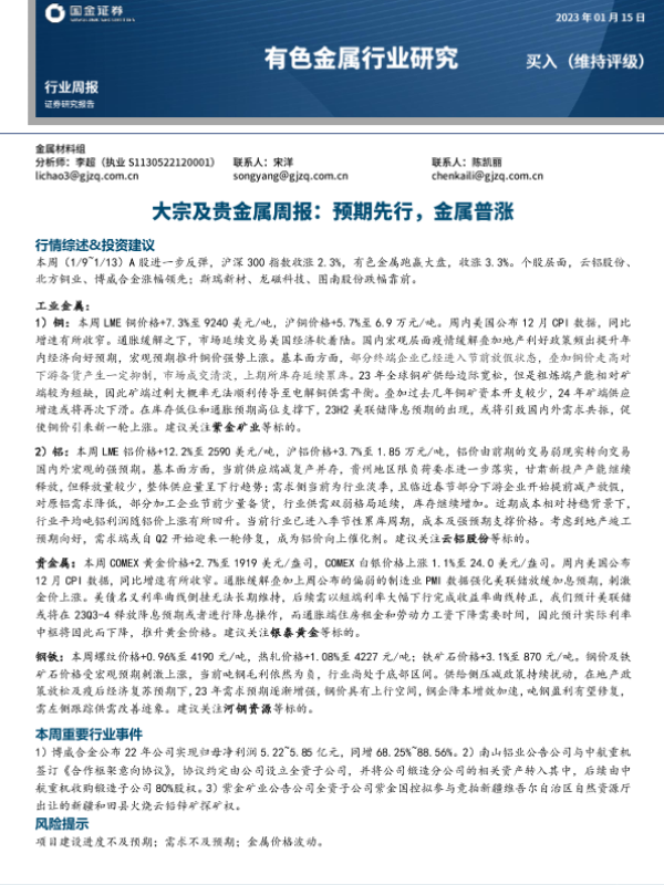 【国金证券】【20230115】20230115-国金证券-大宗及贵金属周报:预期先行,金属普涨-12页