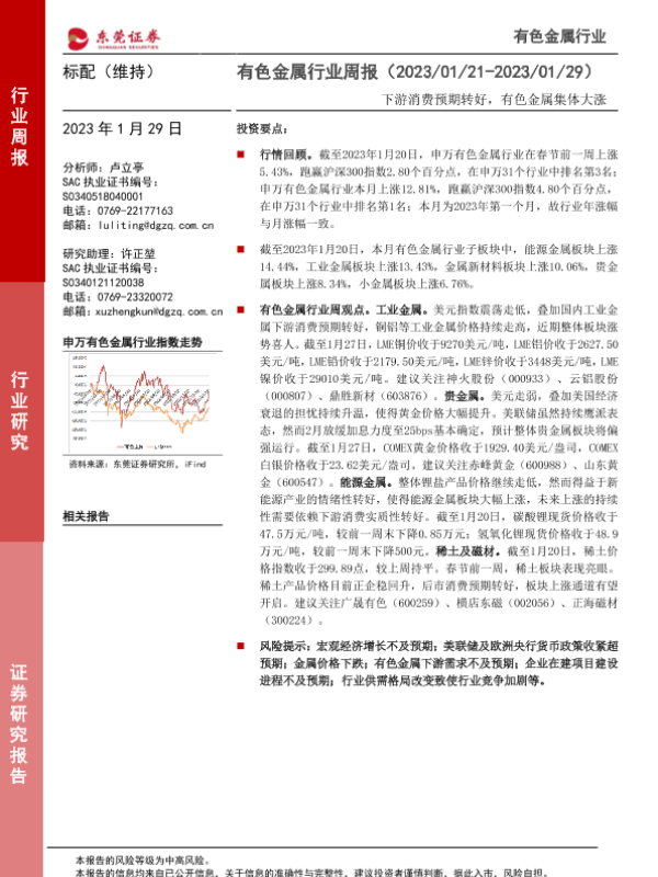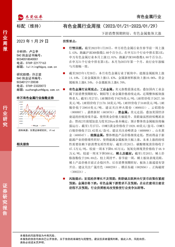 【东莞证券】【20230129】东莞证券-有色金属行业周报:下游消费预期转好,有色金属集体大涨-12页
