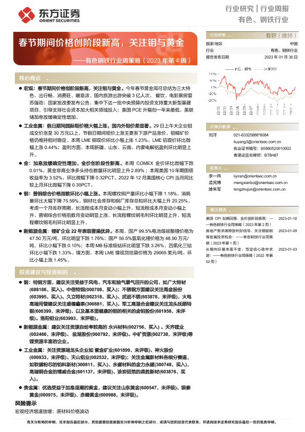 【东方证券】【20230130】2023年第4周有色钢铁行业周策略:春节期间价格创阶段新高,关注钼与黄金-41页