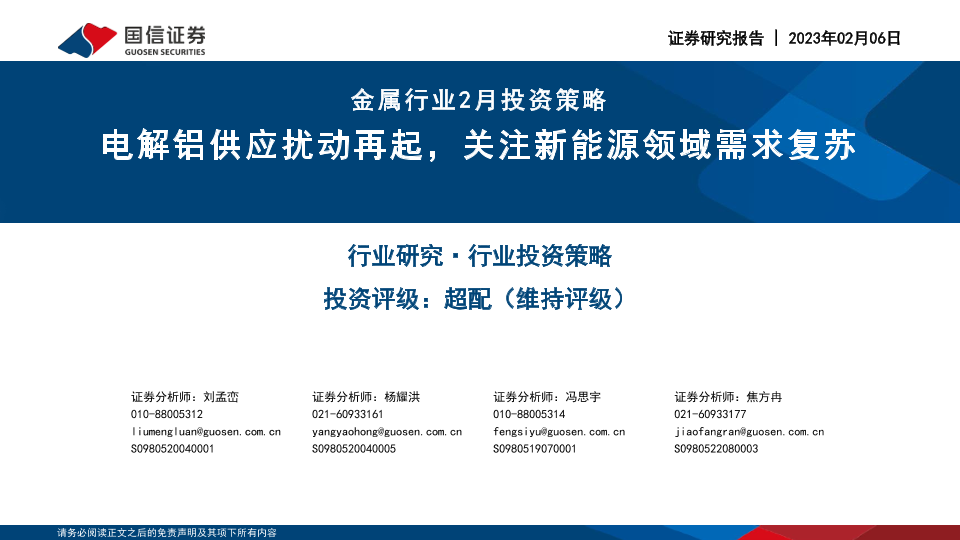 【国信证券】【20230206】20230206-国信证券-金属行业2月投资策略:电解铝供应扰动再起,关注新能源领域需求复苏-48页
