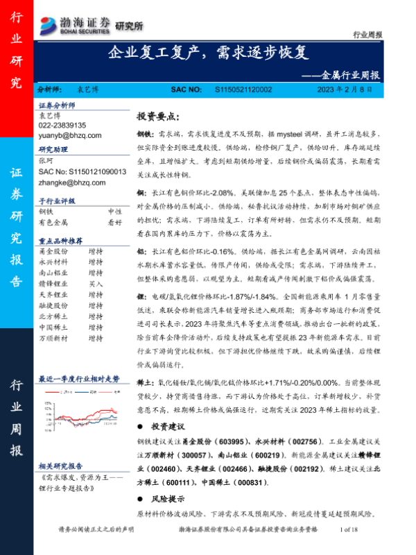 【渤海证券】【20230208】20230208-渤海证券-金属行业周报:企业复工复产,需求逐步恢复-18页