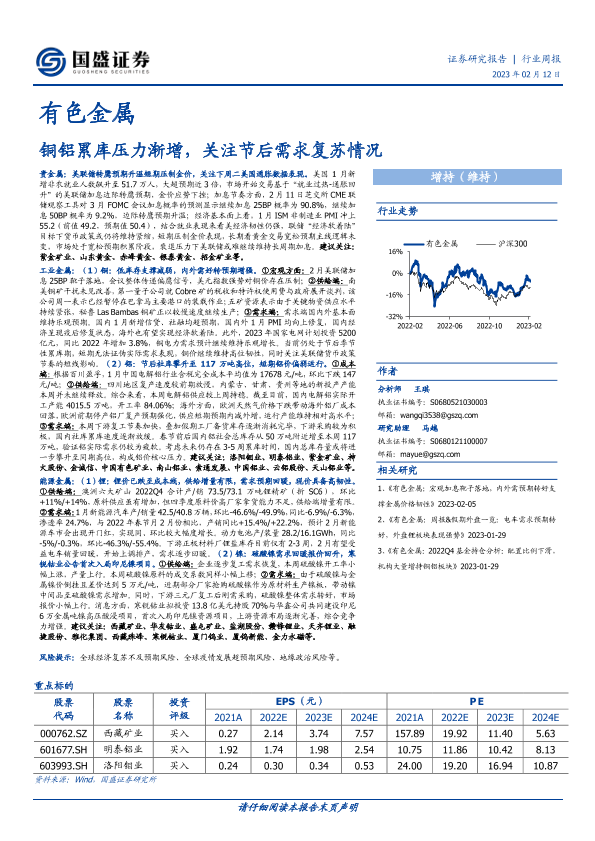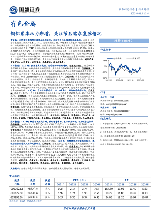 【国盛证券】【20230212】20230212-国盛证券-有色金属行业周报:铜铝累库压力渐增,关注节后需求复苏情况-22页
