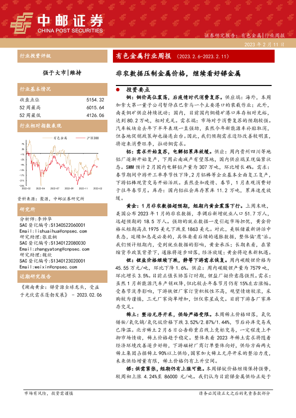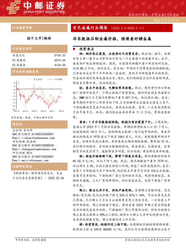 【中邮证券】【20230211】20230211-中邮证券-有色金属行业周报:非农数据压制金属价格,继续看好锑金属-14页