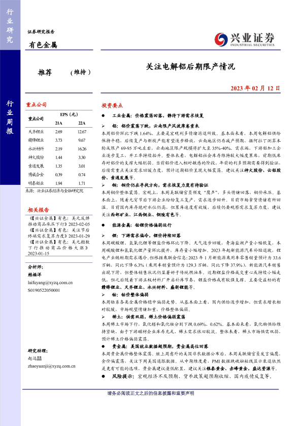 【兴业证券】【20230212】20230212-兴业证券-有色金属行业周报:关注电解铝后期限产情况-20页