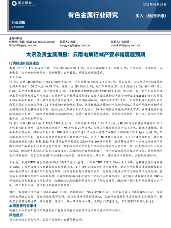 【国金证券】【20230218】20230218-国金证券-大宗及贵金属周报:云南电解铝减产要求幅度超预期-13页