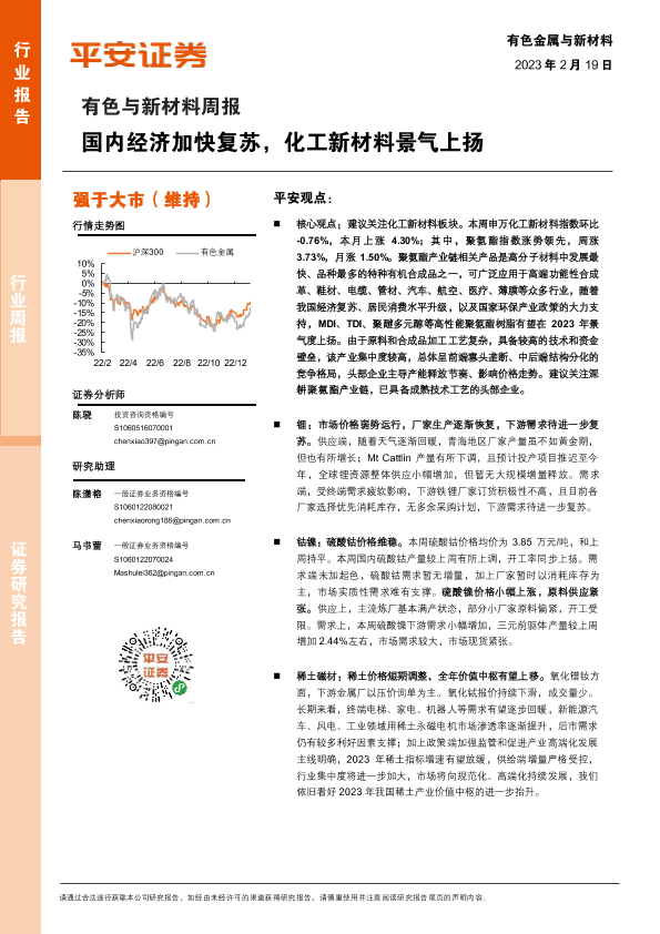 【平安证券】【20230219】20230219-平安证券-有色与新材料周报:国内经济加快复苏,化工新材料景气上扬-16页
