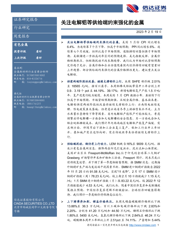【信达证券】【20230219】20230219-信达证券-有色金属周度报告:关注电解铝等供给端约束强化的金属-12页
