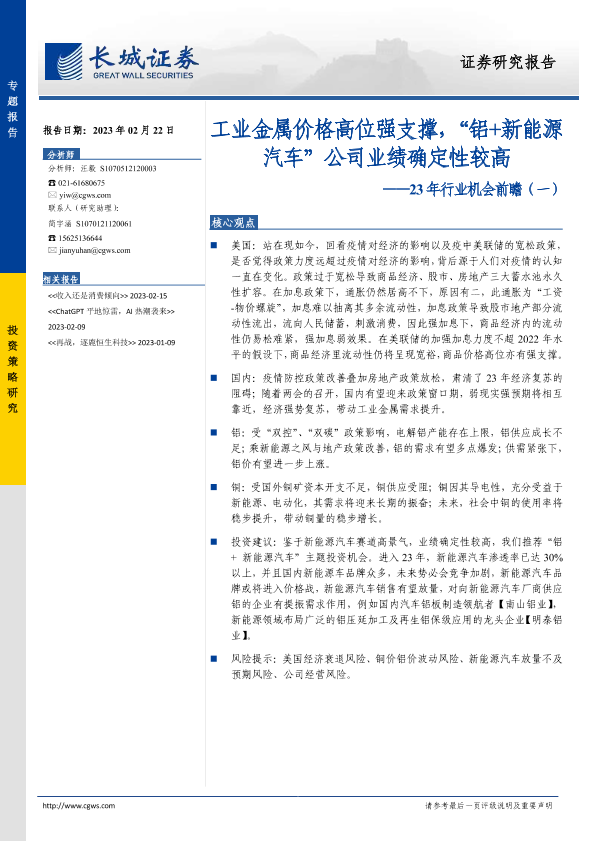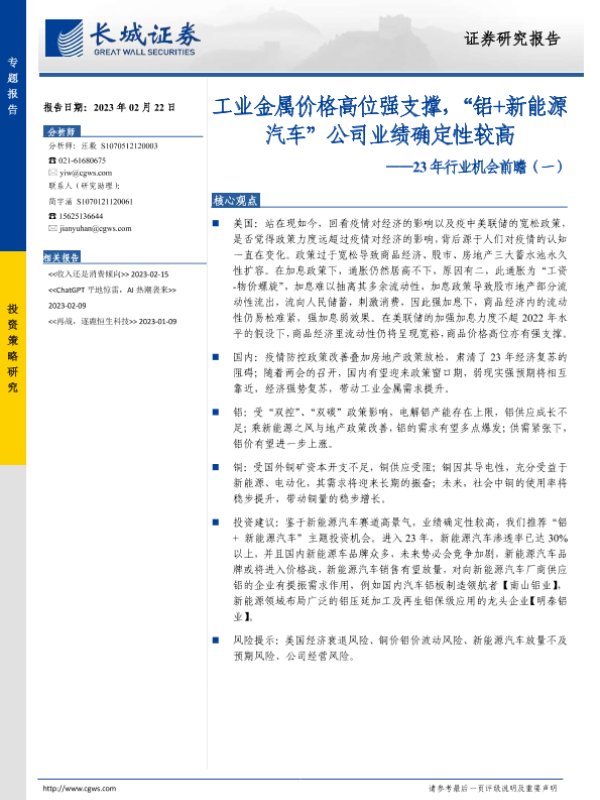 【长城证券】【20230222】23年行业机会前瞻(一):工业金属价格高位强支撑,“铝+新能源汽车”公司业绩确定性较高-10页