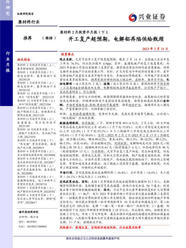 【兴业证券】【20230221】原材料 2月投资半月报(下):开工复产超预期,电解铝再陷供给瓶颈-29页