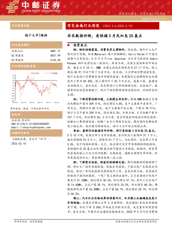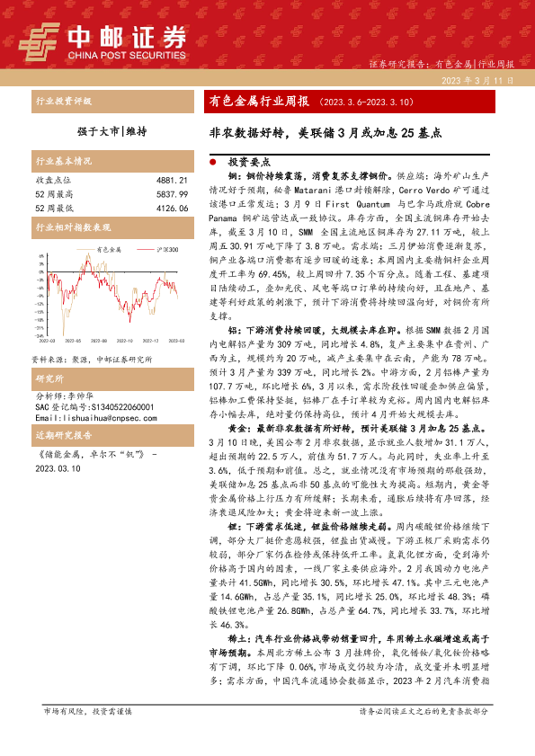 【中邮证券】【20230311】20230311-中邮证券-有色金属行业周报:非农数据好转,美联储3月或加息25基点-14页