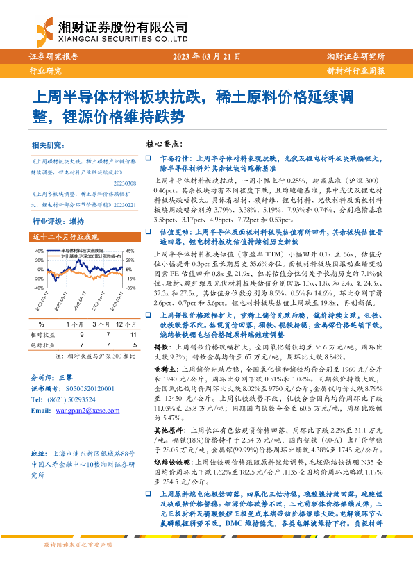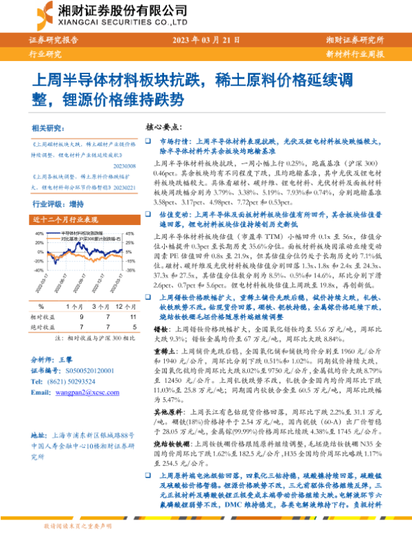 【湘财证券】【20230321】20230321-湘财证券-新材料行业周报:上周半导体材料板块抗跌,稀土原料价格延续调整,锂源价格维持跌势-12页