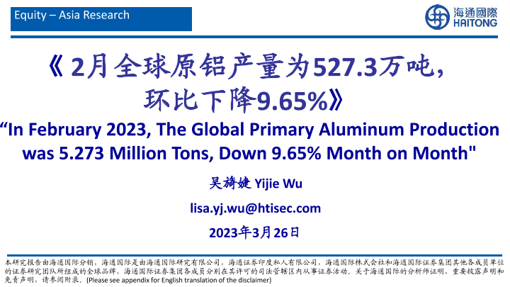 【海通国际】【20230326】2月全球原铝产量为527.3万吨,环比下降9.65%-27页