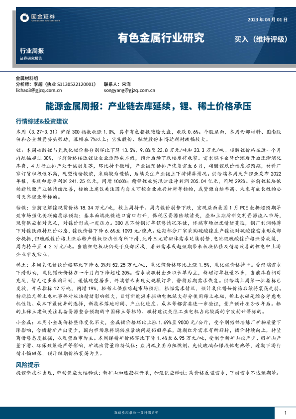 【国金证券】【20230401】20230401-国金证券-能源金属周报:产业链去库延续,锂、稀土价格承压-16页