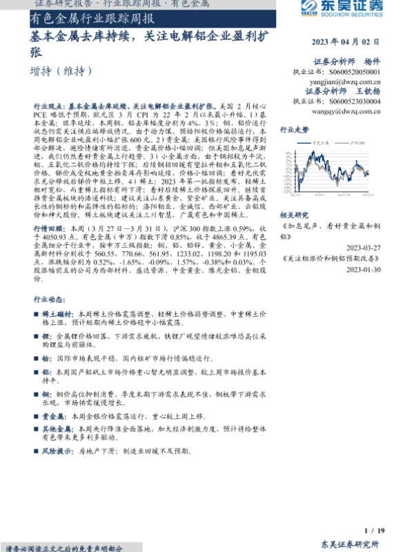 【东吴证券】【20230402】20230402-东吴证券-有色金属行业跟踪周报:基本金属去库持续,关注电解铝企业盈利扩张-19页