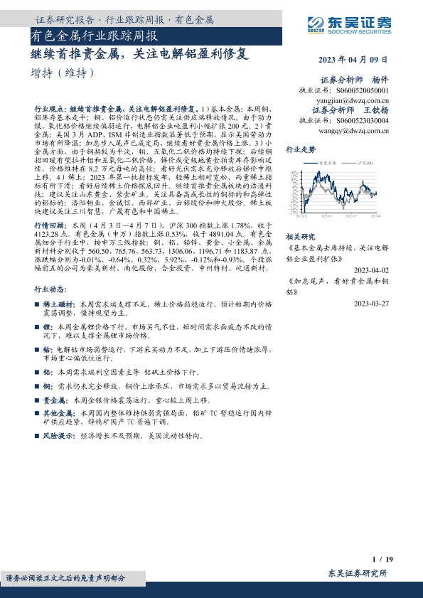 【东吴证券】【20230409】20230409-东吴证券-有色金属行业跟踪周报:继续首推贵金属,关注电解铝盈利修复-19页