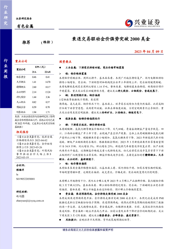 【兴业证券】【20230409】20230409-兴业证券-有色金属行业周报:衰退交易驱动金价强势突破2000美金-20页