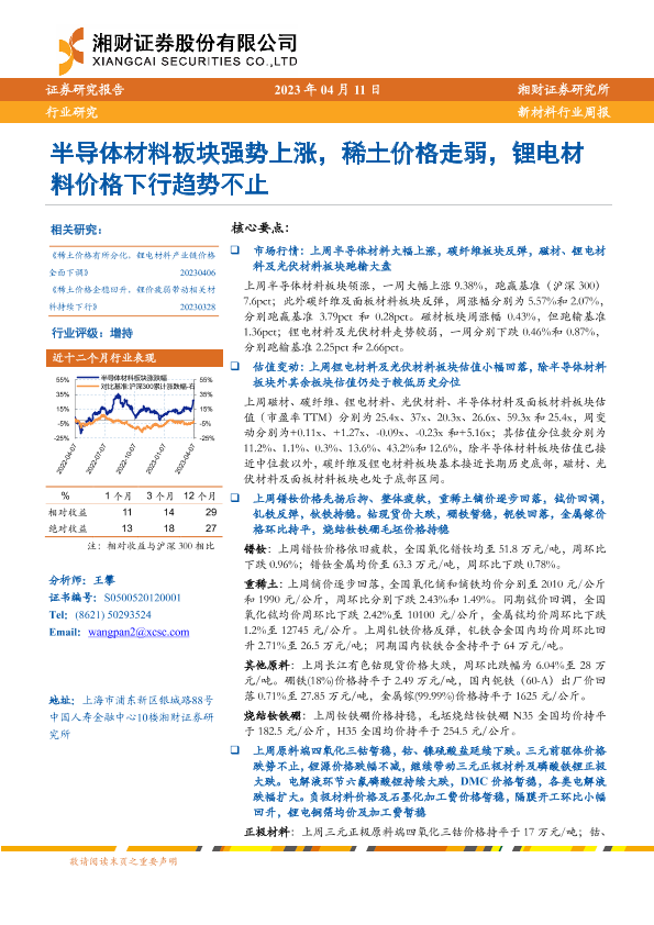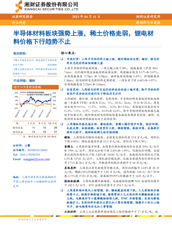 【湘财证券】【20230411】20230411-湘财证券-新材料行业周报:半导体材料板块强势上涨,稀土价格走弱,锂电材料价格下行趋势不止-13页