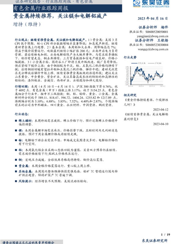 【东吴证券】【20230416】20230416-东吴证券-有色金属行业跟踪周报:贵金属持续推荐,关注镁和电解铝减产-19页