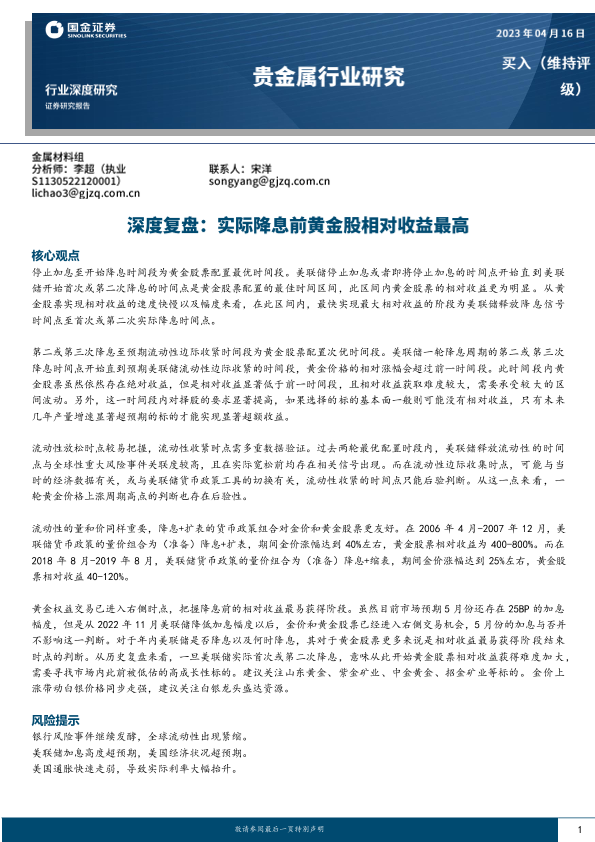 【国金证券】【20230416】20230416-国金证券-贵金属行业研究:深度复盘:实际降息前黄金股相对收益最高-18页