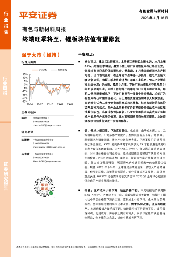 【平安证券】【20230416】20230416-平安证券-有色与新材料周报:终端旺季将至,锂板块估值有望修复-18页