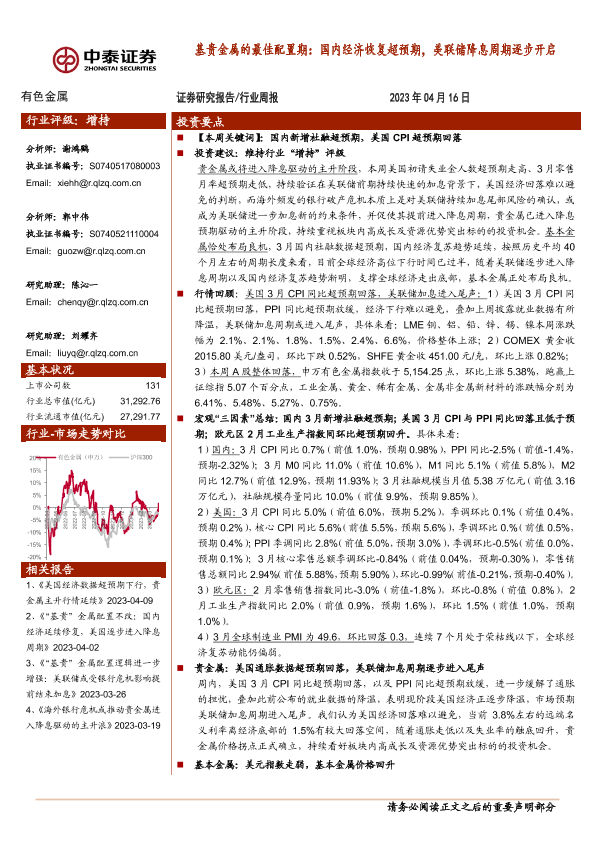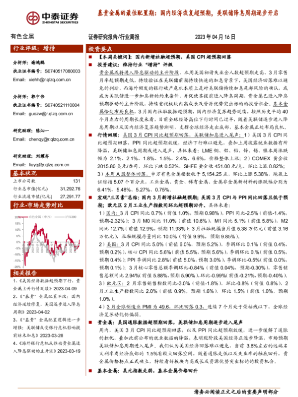 【中泰证券】【20230416】20230416-中泰证券-有色金属行业周报:基贵金属的最佳配置期:国内经济恢复超预期,美联储降息周期逐步开启-33页