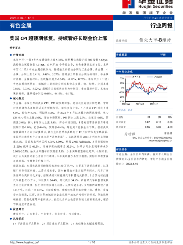 【华金证券】【20230417】20230417-华金证券-有色金属行业周报:美国CPI超预期修复,持续看好长期金价上涨-16页