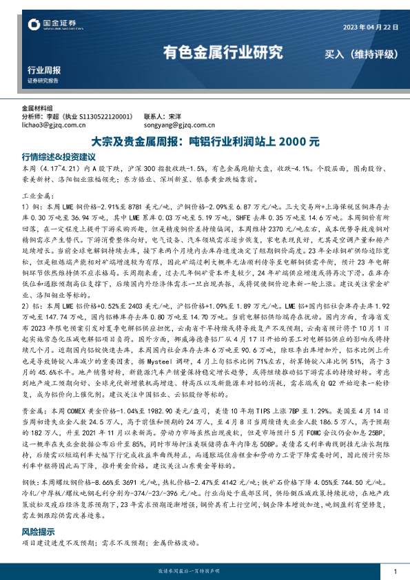 【国金证券】【20230422】20230422-国金证券-大宗及贵金属周报:吨铝行业利润站上2000元-13页