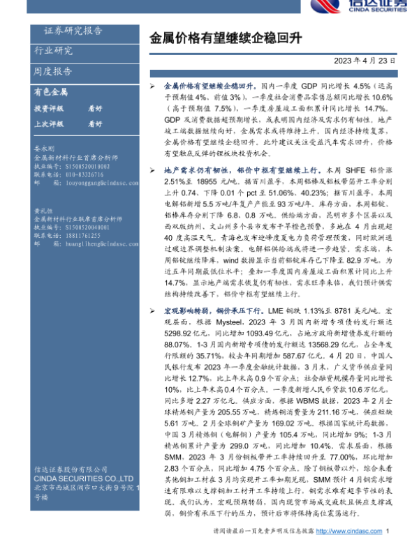 【信达证券】【20230423】20230423-信达证券-有色金属周度报告:金属价格有望继续企稳回升-12页