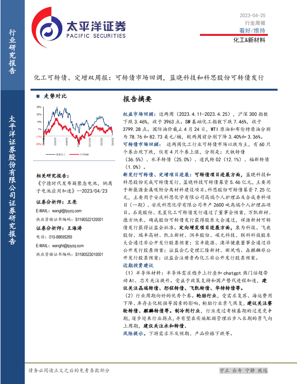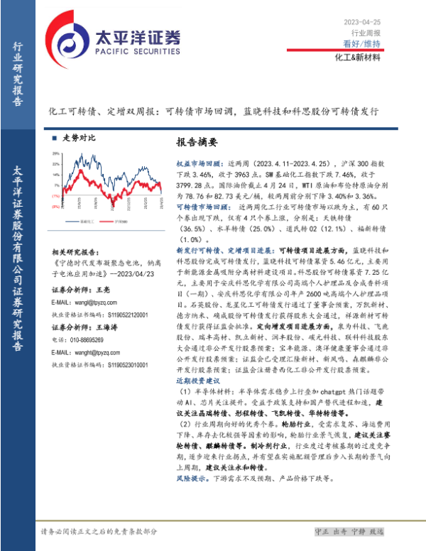 【太平洋证券】【20230425】20230425-太平洋-化工可转债、定增双周报:可转债市场回调,蓝晓科技和科思股份可转债发行-26页