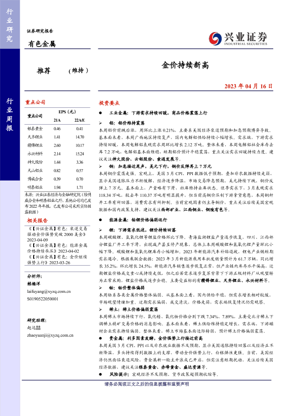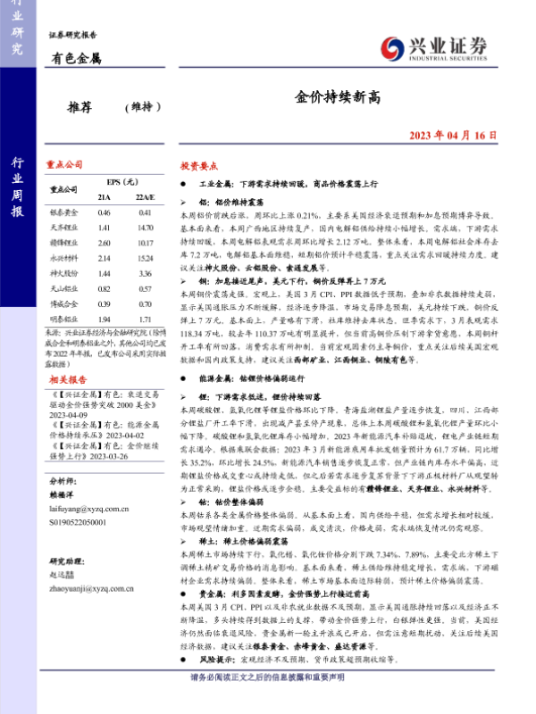 【兴业证券】【20230416】20230416-兴业证券-有色金属行业周报:金价持续新高-20页
