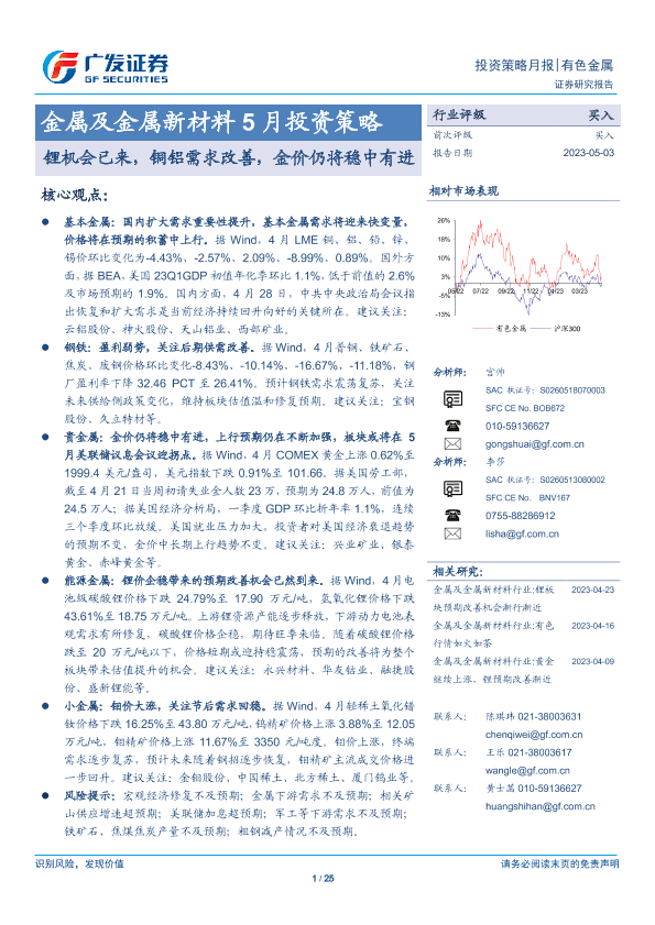 【广发证券】【20230503】金属及金属新材料5月投资策略:锂机会已来,铜铝需求改善,金价仍将稳中有进-25页