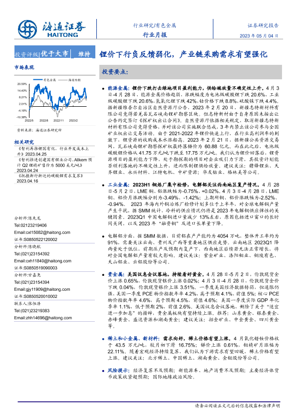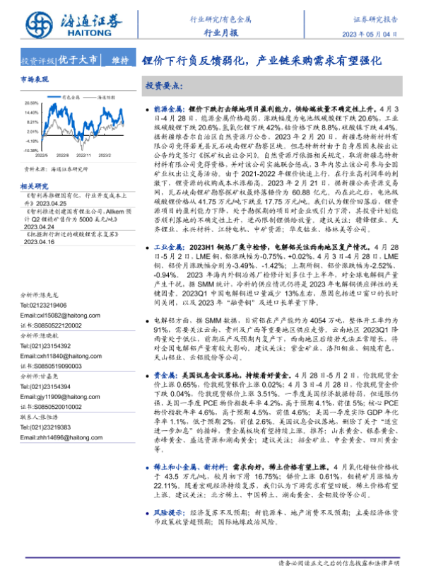 【海通证券】【20230504】20230504-海通证券-有色金属行业月报:锂价下行负反馈弱化,产业链采购需求有望强化-17页