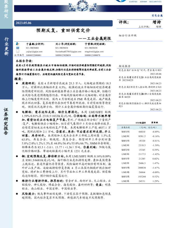 【国泰君安证券】【20230506】20230506-国泰君安-工业金属周报:预期反复,重回供需定价-11页