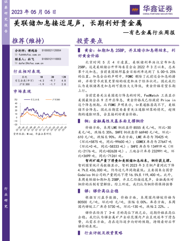 【华鑫证券】【20230506】20230506-华鑫证券-有色金属行业周报:美联储加息接近尾声,长期利好贵金属-13页