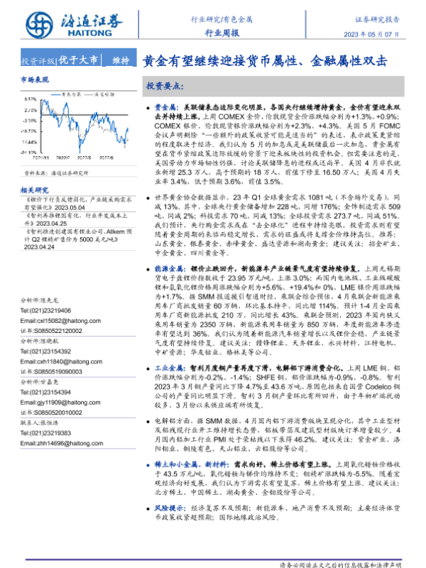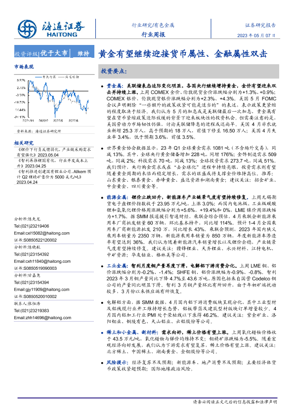 【海通证券】【20230507】20230507-海通证券-有色金属行业周报:黄金有望继续迎接货币属性、金融属性双击-14页